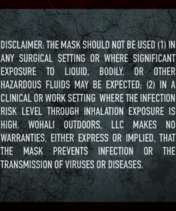 DISCLAIMER: THE MASK SHOULD NOT BE USED (1) IN ANY SURGICAL SETTING OR WHERE SIGNIFICANT EXPOSURE TO LIQUID, BODILY, OR OTHER HAZARDOUS FLUIDS MAY BE EXPECTED; (2) IN A CLINICAL OR WORK SETTING WHERE THE INFECTION RISK LEVEL THROUGH INHALATION EXPOSURE IS HIGH. WOHALI OUTDOORS, LLC MAKES NO WARRANTIES, EITHER EXPRESS OR IMPLIED, THAT THE MASK PREVENTS INFECTION OR THE TRANSMISSION OF VIRUSES OR DISEASES.