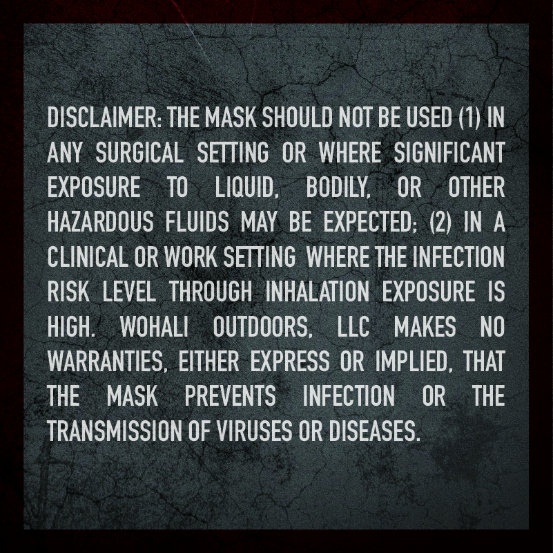 DISCLAIMER: THE MASK SHOULD NOT BE USED (1) IN ANY SURGICAL SETTING OR WHERE SIGNIFICANT EXPOSURE TO LIQUID, BODILY, OR OTHER HAZARDOUS FLUIDS MAY BE EXPECTED; (2) IN A CLINICAL OR WORK SETTING WHERE THE INFECTION RISK LEVEL THROUGH INHALATION EXPOSURE IS HIGH. WOHALI OUTDOORS, LLC MAKES NO WARRANTIES, EITHER EXPRESS OR IMPLIED, THAT THE MASK PREVENTS INFECTION OR THE TRANSMISSION OF VIRUSES OR DISEASES.